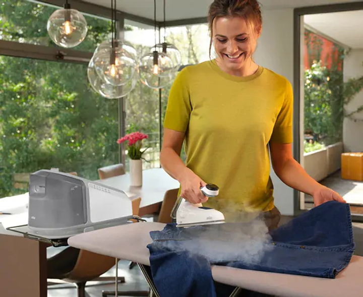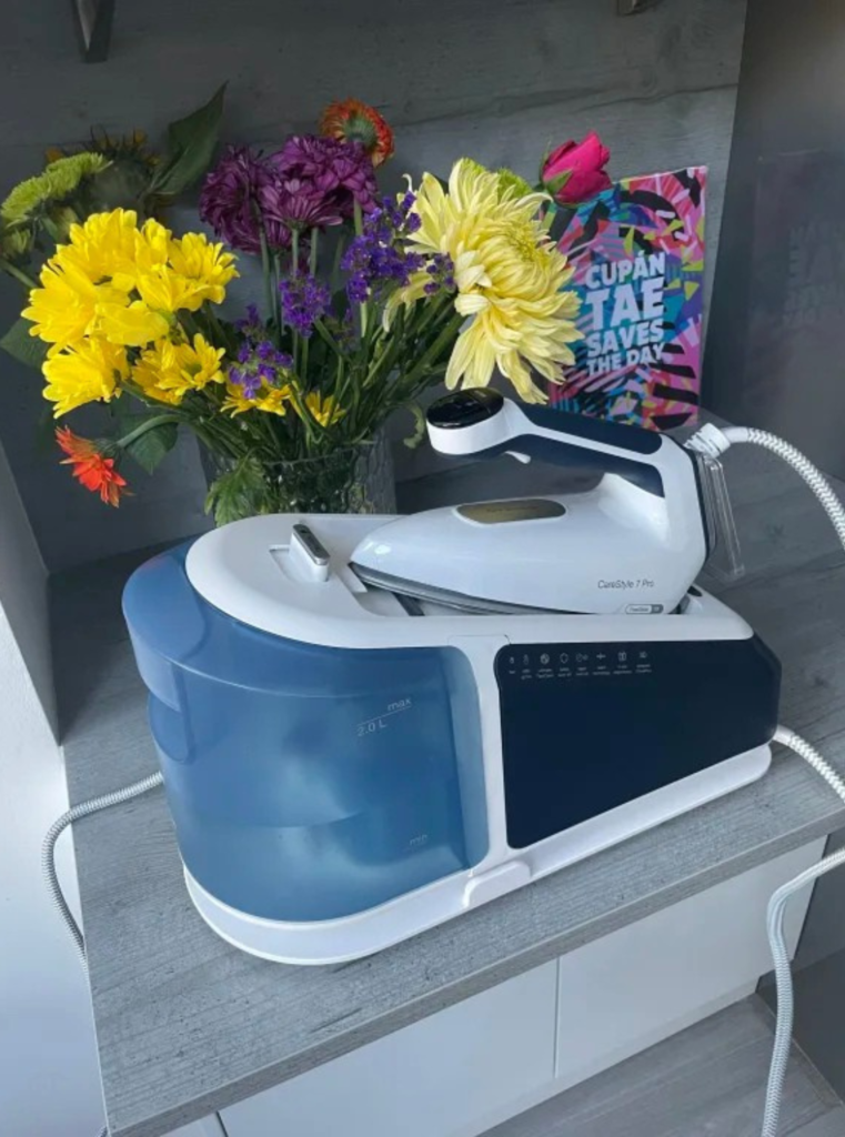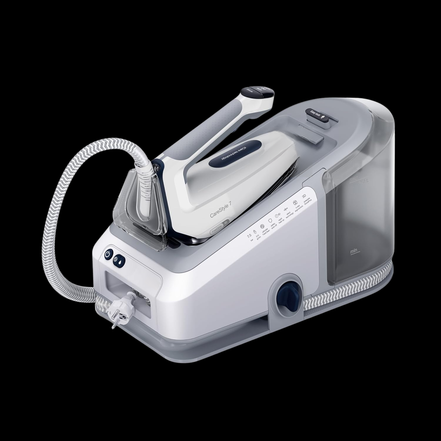 La stazione da stiro offre una pressione di 7,5 bar, con un colpo vapore potente da 510 g/min e vapore continuo da 150 g/min, sufficiente per eliminare anche le pieghe più difficili.
